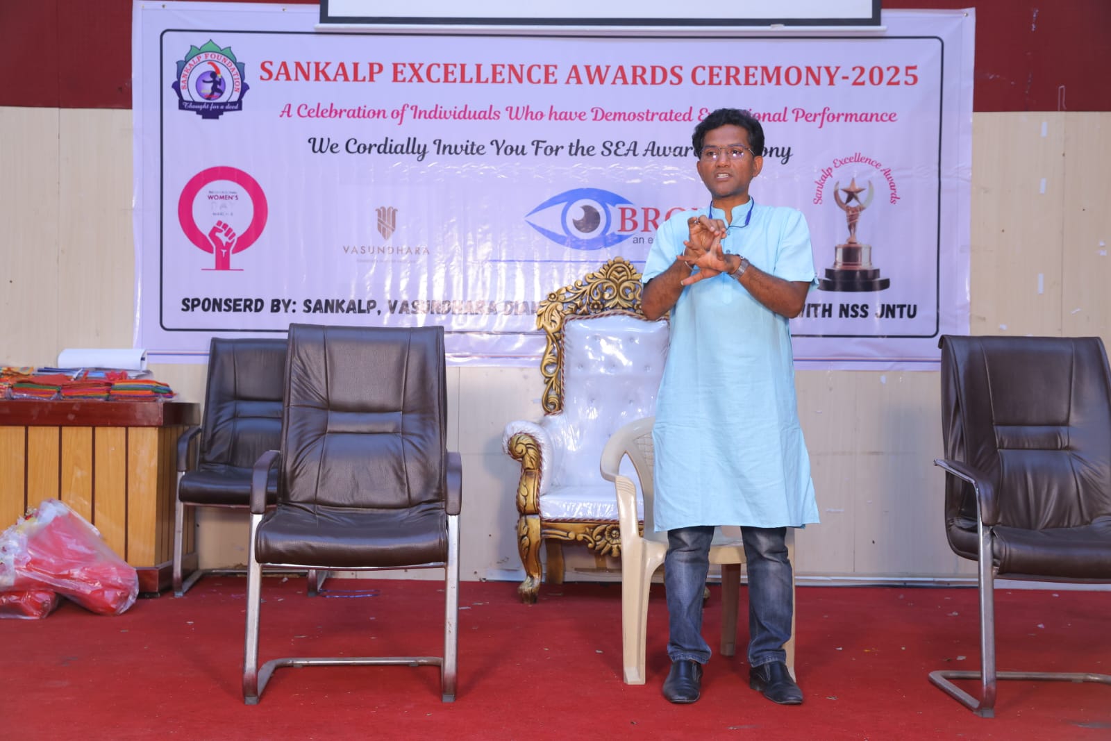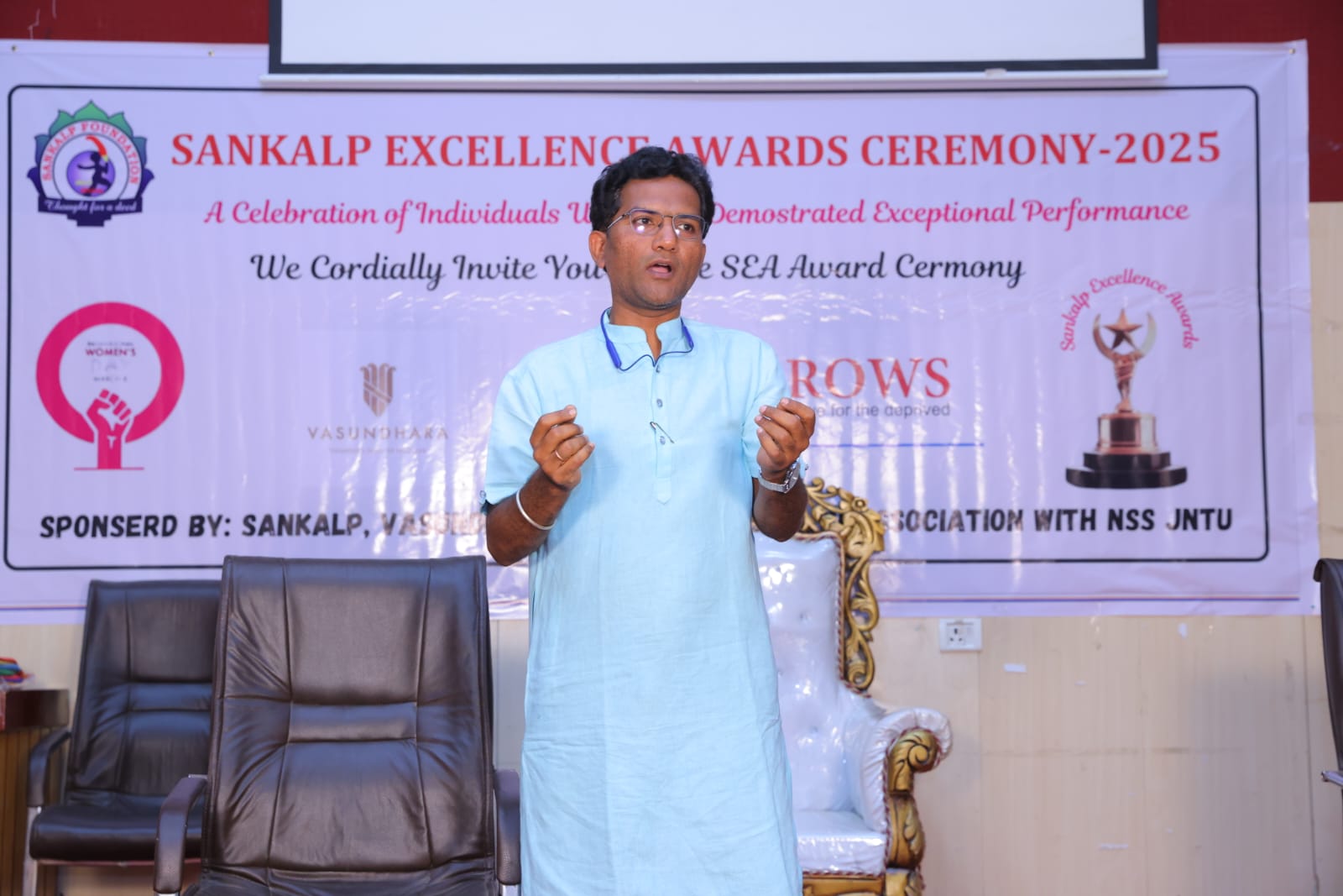 It is with profound gratitude that I share the honor of receiving an Excellence Award for my contributions to yoga services in our community. This recognition was graciously bestowed upon me on March 29th by Sankalp NGO in partnership with Jawaharlal Nehru Technological University’s National Social Service division during a distinguished ceremony at the University seminar hall.